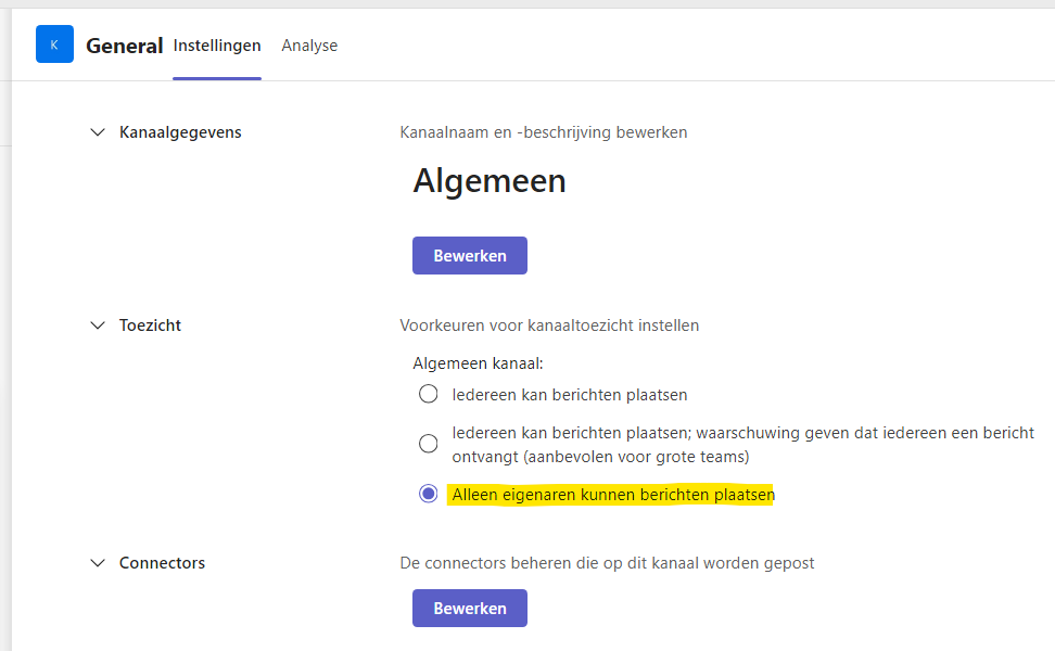 Het wordt geadviseerd om in te stellen dat in het Algemeen kanaal alleen eigenaren berichten kunnen plaatsen.