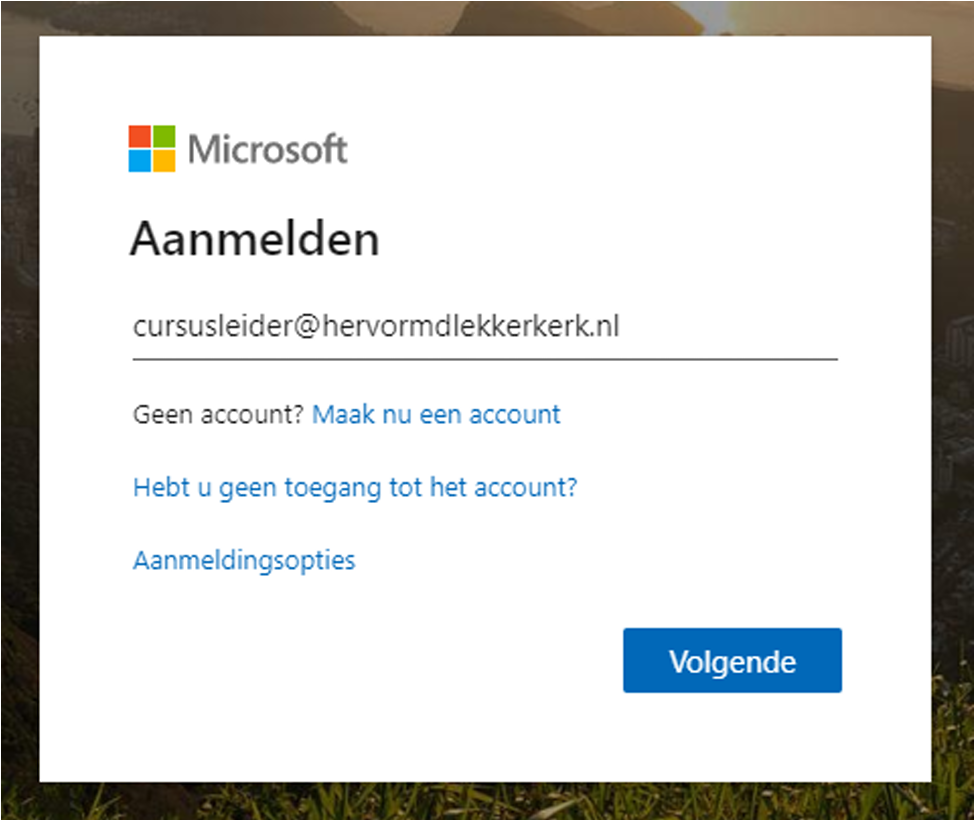 Klik op de knop Aanmelden in het midden van het scherm en u komt in een klein scherm “Aanmelden”. Geef hier uw kerk-mailadres op wat u in de welkom e-mail heeft ontvangen en klik “Volgende”.