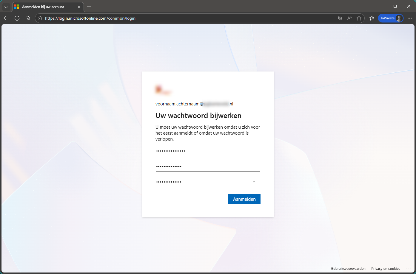 Microsoft 365 vraagt u nu om direct een zelfgekozen wachtwoord in te stellen wat alleen bij u bekend is. Kies een wachtwoord wat veilig is en wat u goed kunt onthouden. Bij voorkeur een wachtwoord wat u niet bij (veel) andere websites gebruikt (dat is veiliger mocht uw wachtwoord gestolen worden van een website).