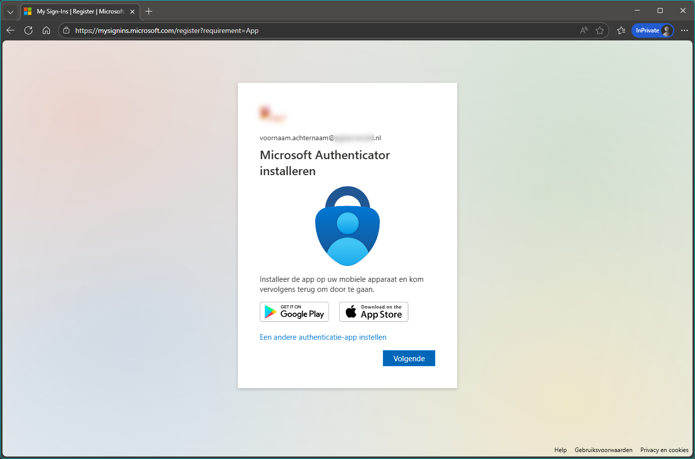 In het volgende scherm wordt gevraagd om een authenticatie-app te installeren: