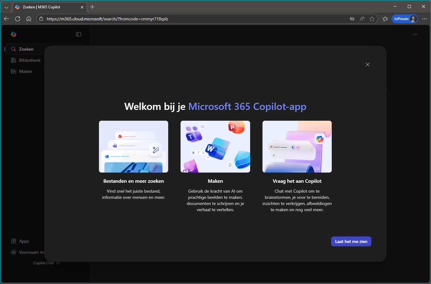 Microsoft 365 start vanzelf een kleine introductie aan de hand van een paar schermpjes. Klik op het kruisje rechtsboven om deze melding te sluiten of op Laat het me zien om een korte uitleg te volgen op het scherm.