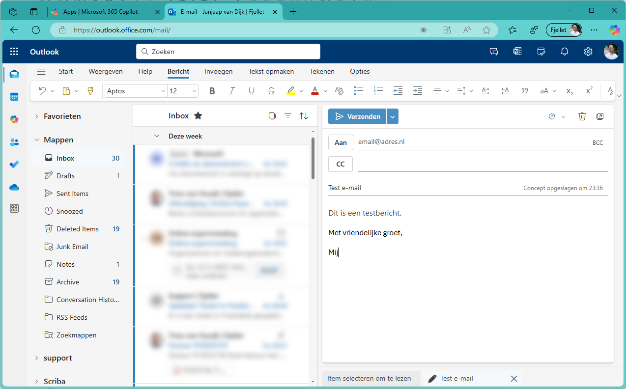 Controleer of de verzonden mail goed is aangekomen. Sluit het browser scherm of -tabblad om Outlook Online af te sluiten.